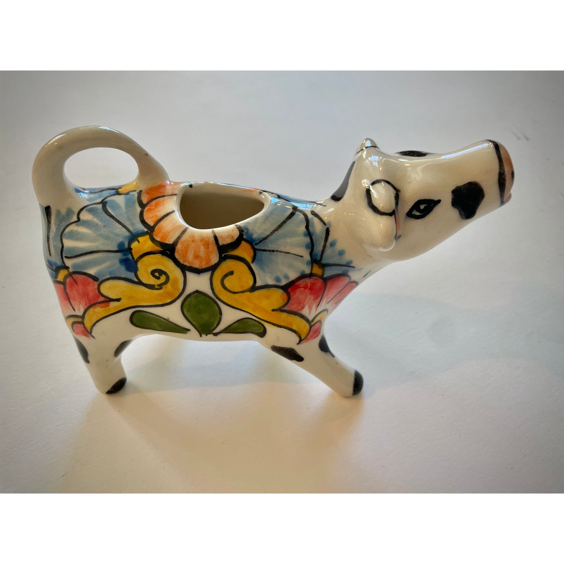 Mit jeder Bewegung ein kleines Vergnügen: Dieser bezaubernde, handbemalte Talavera-Milchgießer in Kuhform vereint spielerischen Charme mit kunstvoller Handwerkskunst.